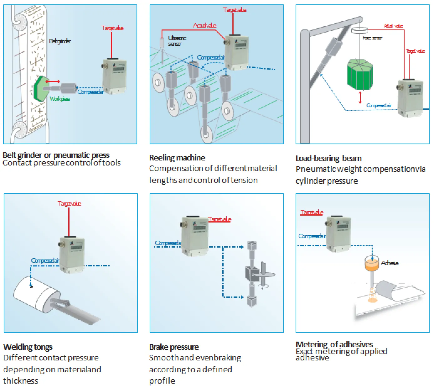 - Hassas Kuvvet Uygulaması: Zımpara kafasını veya pres pistonunu hareket ettiren pnömatik silindire beslenen hava basıncı, QKL tarafından dijital olarak kontrol edilir. QKL’in %0.25 FS doğruluğu, proses boyunca temas kuvvetinin tam olarak ayarlanmasını sağlar.