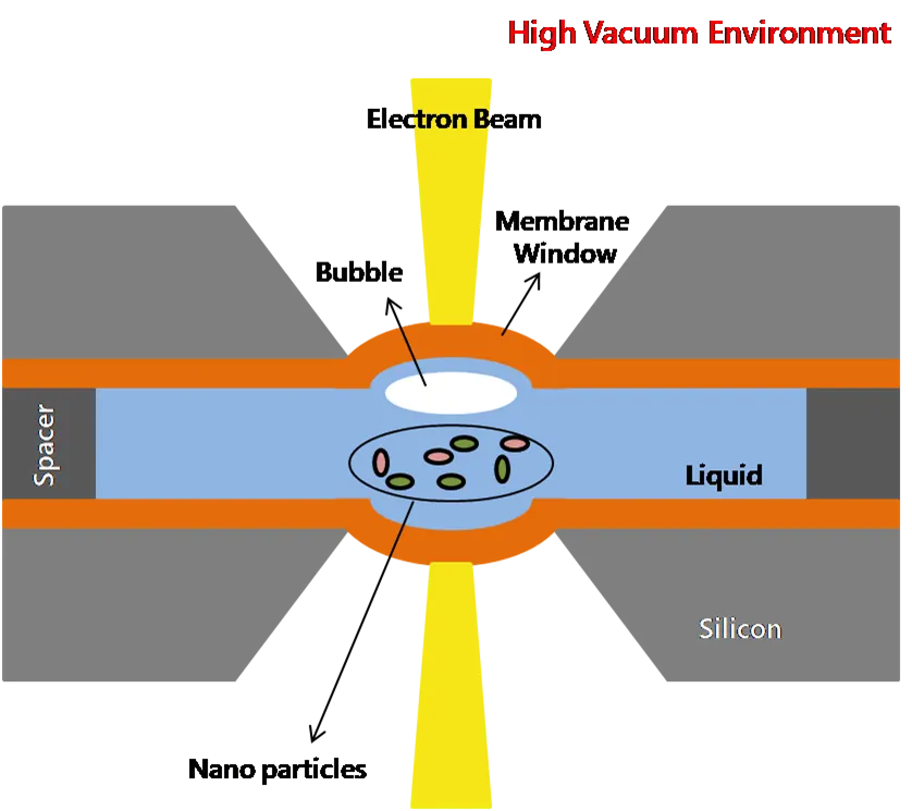 Sıvı faz iletim elektron mikroskopisi, sıvılardaki nano malzeme süreçlerinin gerçek zamanlı izlenmesi için temel bir teknik haline gelmiştir. Sıvı ile iletim elektron mikroskobunun yüksek vakumu arasındaki basınç farkı nedeniyle, silikon nitrür zar penceresi genellikle bükülür, bu da sıvı havuzunun vakum basıncı ayarlanarak dinamik olarak ayarlanabilir. Bu, yüksek çözünürlüklü görüntüleme için merkezi pencere bölgesinde ultra ince bir sıvı katmanı ile sonuçlanır.