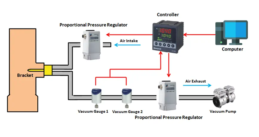 1 kPa ~ 100 kPa aralığındaki düşük vakum derecesi kontrolü için, kontrolörün 1000 Torr aralığındaki vakum göstergesi 2 sinyalini toplaması ve aynı zamanda hava girişi için Oransal Basınç Regülatörünü belirli bir açık durumda sabitlemesi gerekir ve kontrolör egzoz için Oransal Basınç Regülatörünü kontrol eder. Açılış otomatik olarak ayarlanır. Bu tür geniş bir aralıkta vakum derecesi kontrolüne ulaşmak için, bağımsız bir çift kanallı KaoLu’nun QKL serisi yüksek hassasiyetli Oransal Basınç Regülatörü ile donatılmıştır. İki kanal, iki vakum göstergesinin sinyal alımına karşılık gelir ve iki bağımsız kapalı döngü kontrol döngüsü oluşturur. Farklı aralıklardaki vakum derecesini otomatik olarak kontrol eder.