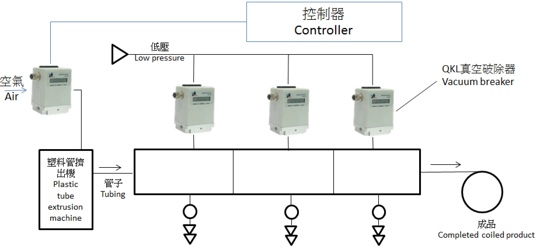 QKL Elektronik Basınç Regülatörü, bu uygulamada bir vakum kesici (vacuum breaker) görevi görerek boyutlandırma haznesinin her bir bölgesindeki vakum seviyesini hassasiyetle yönetir.