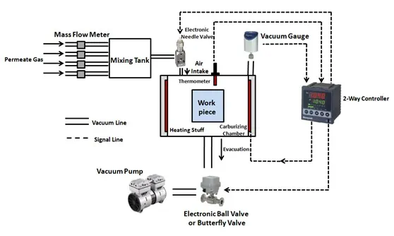 Vakum Kontrolünün Temel İlkesi dinamik kontrol yöntemidir: Kontrol ayarlanan değerine ve vakum ölçerin ölçülen değerine göre, karbürleme odasının hava giriş akışı ve egzoz akışı ayrı ayrı ayarlanır, böylece içeri ve dışarı akış dinamik bir dengeye ulaşır. Otomatik kontrol için PID kontrol algoritmaları ve ilgili kontrolcüler gereklidir.