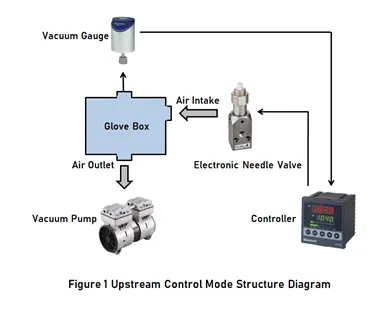 Aşağı akış vakum pompasının pompalama hızının sabit tutulması koşulu altında, yukarı akış kontrol modu, vakum ölçerin ölçüm sinyaline göre yukarı akış hava giriş portunun oransal akış kontrol valfinin açılışını PID vakum basınç kontrolcüsü aracılığıyla ayarlamaktır. Yani, giriş akışını kontrol ederek eldiven kutusundaki basıncı ayarlanan noktada tutmaktır. Yukarı akış modu genellikle yüksek vakum kontrolü için kullanılır.