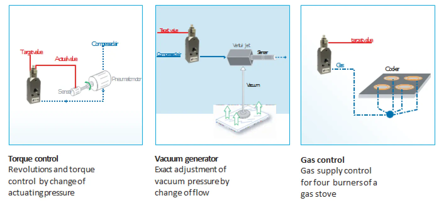 Yüksek hassasiyetli elektronik oransal basınç regülatörleri, genellikle lazer kesim makinası, kauçuk ve plastik ekipmanları gibi yüksek tekrarlanabilirlik ve hassasiyet gerektiren uygulamalarda tercih edilmektedir.