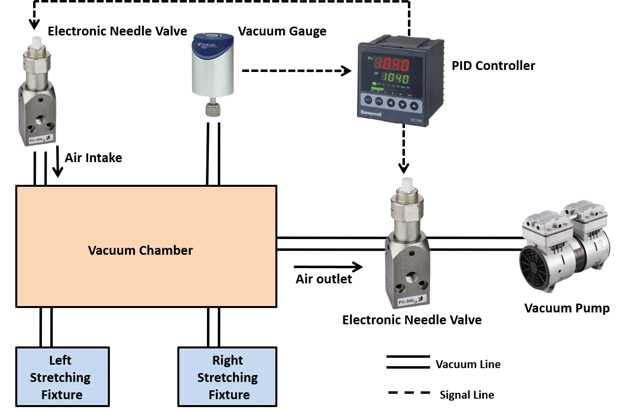Şekilde gösterilen vakum derecesi kontrol sistemi temel olarak bir elektronik iğneli valf (oransal valf), bir vakum ölçer, bir PID kontrolcü ve bir vakum pompasından oluşur.