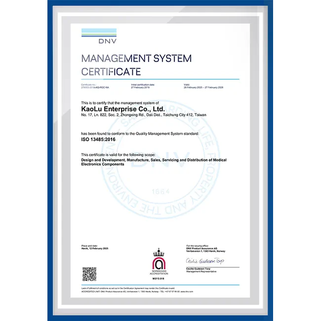 Kao Lu, ürün kalitesine ve doğruluğuna önem verir. Ürün güvenilirliğini sağlamak için, test ekipmanlarımız her yıl üçüncü taraf incelemesinden geçer ve üretim sürecimiz tıbbi ekipman üretimi için ISO 13485 sertifikasına sahiptir. Ürünlerimiz, uluslararası alanda tanınmış tedarikçilerden temin edilen parçalardan yapılır ve kullanımdan önce kalite kontrolünden geçirilir.