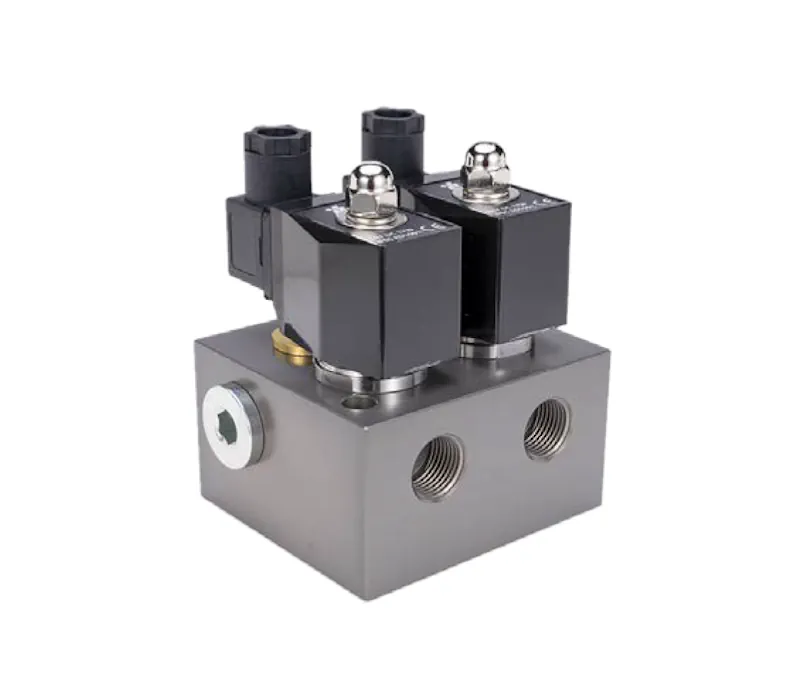 2/2 direkt etkili solenoid valf. Tek bir çıkış portu ile çift giriş veya üçlü giriş seçenekleri. Birden fazla giriş akışkanı arasında çıkışları değiştirmek için kullanılır. Her giriş portuna geri dönüşsüz valfler (non-return valves) takılıdır.