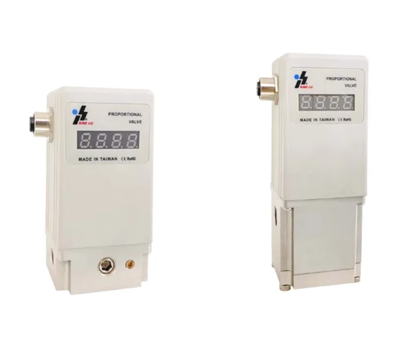 0-8 bar oransal basınç regülatörlerinde 3 farklı seri mevcuttur: düşük akış (< 20 L/dk), yüksek akış (> 500 L/dk) ve ekonomik tip yüksek akış. Düşük akış versiyonu, iki adet solenoid valf, bir adet yüksek işlem hızına sahip dijital elektronik kart ve bir adet basınç dönüştürücüsünden (transdüser) oluşur. Yüksek akış versiyonunun yapısı benzerdir, ancak buna ek olarak bir hacim yükseltici (volume booster) bulunur. Ekonomik tip oransal basınç regülatörü, basit işlemler gerektiren müşterilerimiz için makul hassasiyet (%0,5), yüksek hız ve ekonomik çözüm sunduğumuz versiyondur.