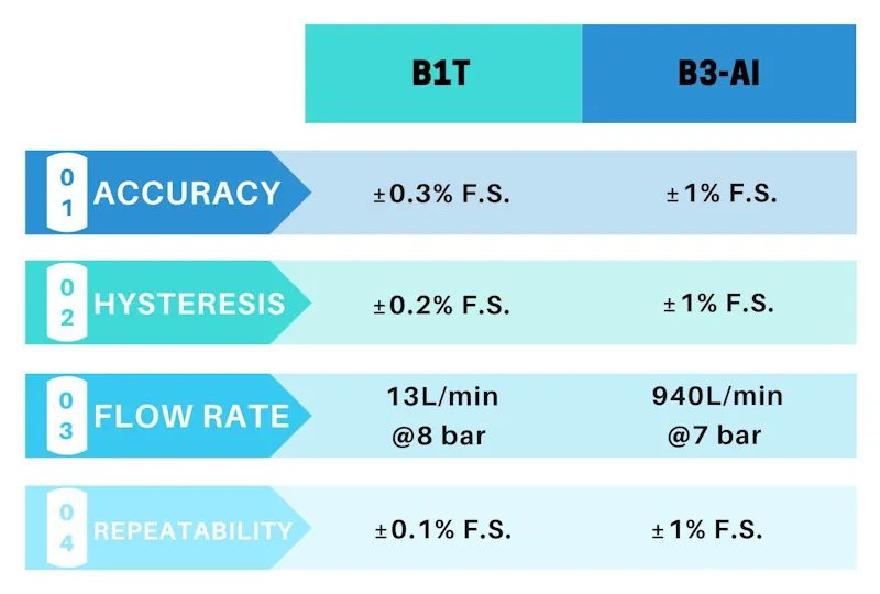 QKL-B1T düşük akışlı elektro-pnömatik basınç regülatörü; 2 bar, 4 bar ve 8 bar olmak üzere üç farklı çıkış basıncı aralığı seçeneğine sahiptir. 2 bar versiyonu ile basınç aralığını daha düşük bir değere göre özelleştirmek mümkündür. Bu versiyon; 0,0005 bar ultra yüksek çözünürlük, ultra yüksek stabilite ve hızlı tepki süresi sunar. Bu elektro-pnömatik basınç regülatörü, dünya lideri ABD tıbbi cihaz üreticilerinde mikroakışkan (microfluidics) endüstrisinde yaygın olarak kullanılmış olup, dozajlama ve sıvı dağıtım sektörlerinde de popülerdir.