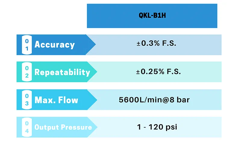 Dijital basınç regülatörü, çıkış hava basıncının giriş elektronik sinyaliyle orantılı olduğu bir hava basınç regülatörü türüdür. QKL-B1H serisi dijital basınç regülatörü, genel hava basıncı uygulamalarında yüksek akış hızı sunar. Yapısı iki solenoid valf, bir dahili basınç dönüştürücü, akıllı elektronikler ve dahili bir hacim yükselticiden (volume booster) oluşur. Hem statik hem de dinamik büyük akış hızı uygulamaları için idealdir. QKL-B1H dijital basınç regülatörünün çıkış basıncı, giriş komut sinyaliyle %0.1 hata ile doğrusal olarak orantılıdır.