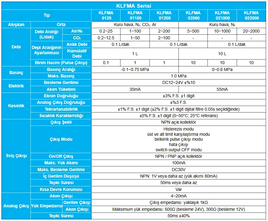 KLFMA Serisi Dijital Kütle Akış Sensörü, gazların kütle akışını yüksek hassasiyetle ölçmek için tasarlanmıştır. Belirtilen elektriksel özellikler, sensörün endüstriyel ortamlardaki standart kontrol sistemlerine kolayca entegre edilebilmesini sağlar. Özellikle 4-20mA analog çıkış standardı, uzun mesafeli veri iletiminde güvenilir ve stabil performans sunarak proses kontrol uygulamaları için ideal bir çözümdür.