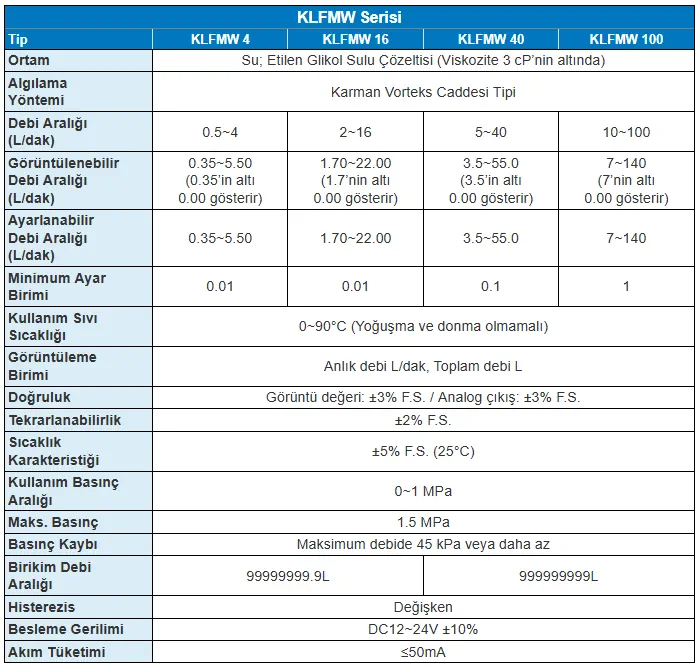 KLFMW Serisi, su ve Etilen Glikol sulu çözeltileri gibi düşük viskoziteli sıvıların akışını son derece doğru ve güvenilir bir şekilde izlemek üzere tasarlanmış dijital bir akış sensörüdür. Karman Vorteks Yolu (Karman Vortex Street) prensibini kullanarak anlık ve kümülatif akış hızlarını ölçer. Kompakt yapısı, geniş akış aralığı seçenekleri ve NPN çıkışı ile 4-20mA analog çıkış kombinasyonu sayesinde hem basit izleme hem de karmaşık endüstriyel proses kontrol sistemlerine kolayca entegre edilebilir, böylece su yönetimi ve dozajlama uygulamalarında yüksek performans sunar.